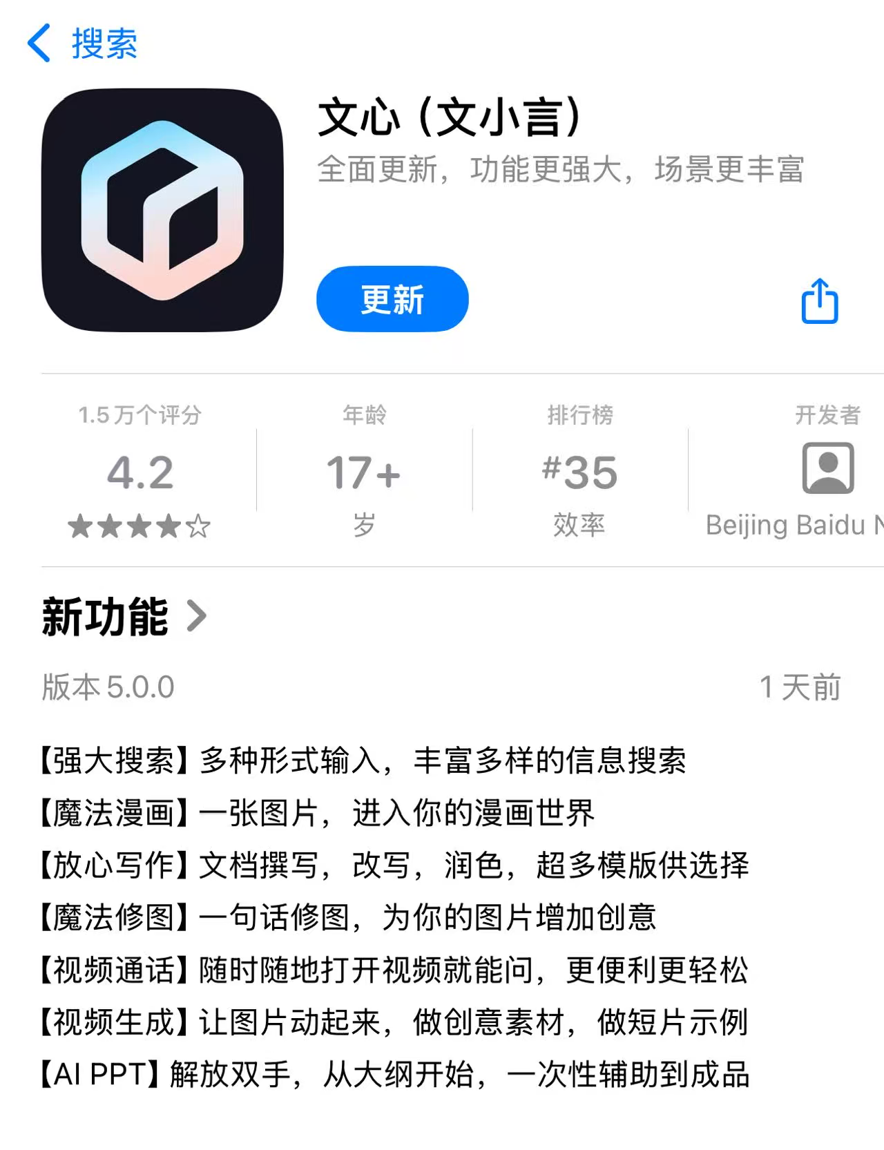 11月1日,百度文小言App正式升级文心App,并上线“魔法漫画”等AI功能。