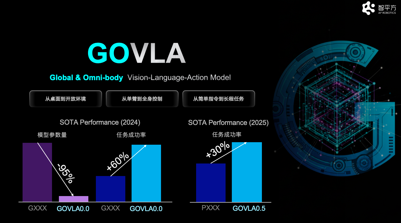 在模型侧,智平方通过自研 GOVLA 大模型,为机器人提供理解物理世界和泛化操作能力的“通用大脑”。