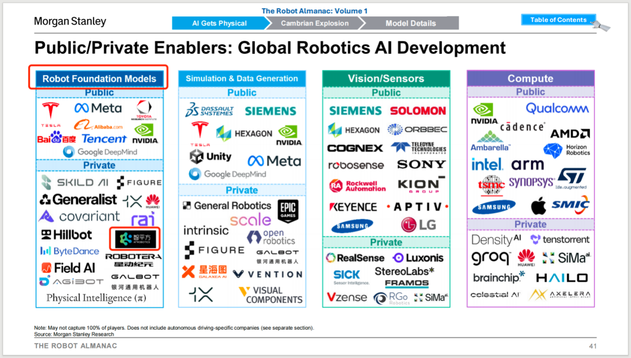 在这份定调行业走向的报告中,大摩关注的并不是“谁更会做机器人”,而是谁在构建下一代机器人的智能底座。